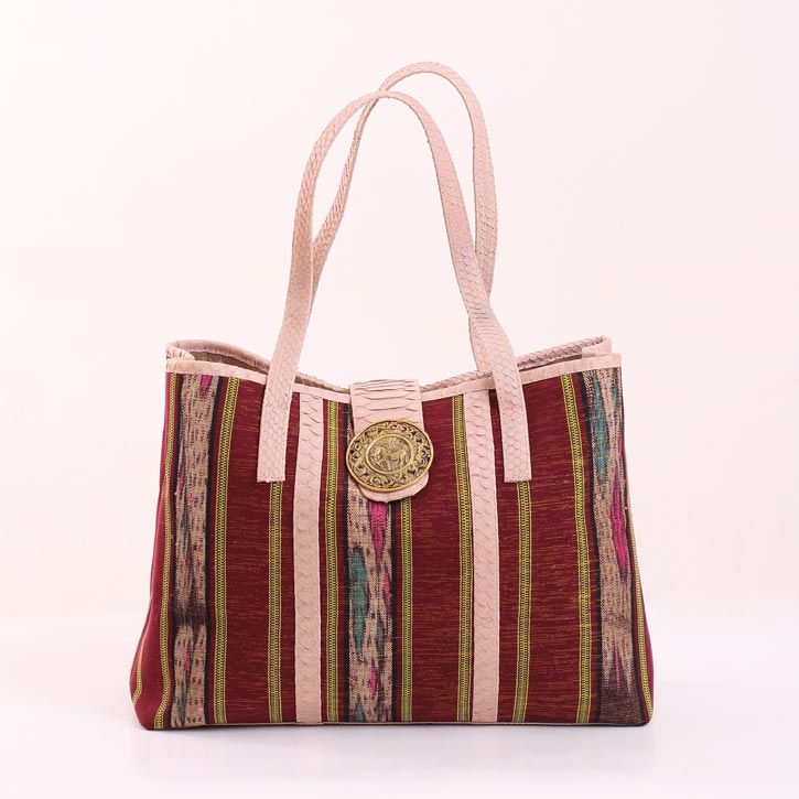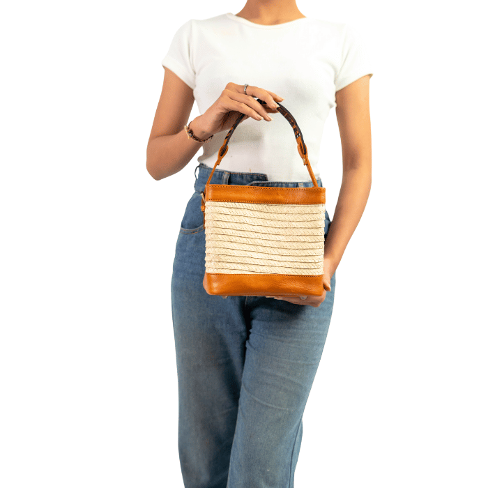 Tas anyaman lontar kombinasi kulit dengan grafir logo rotenbi