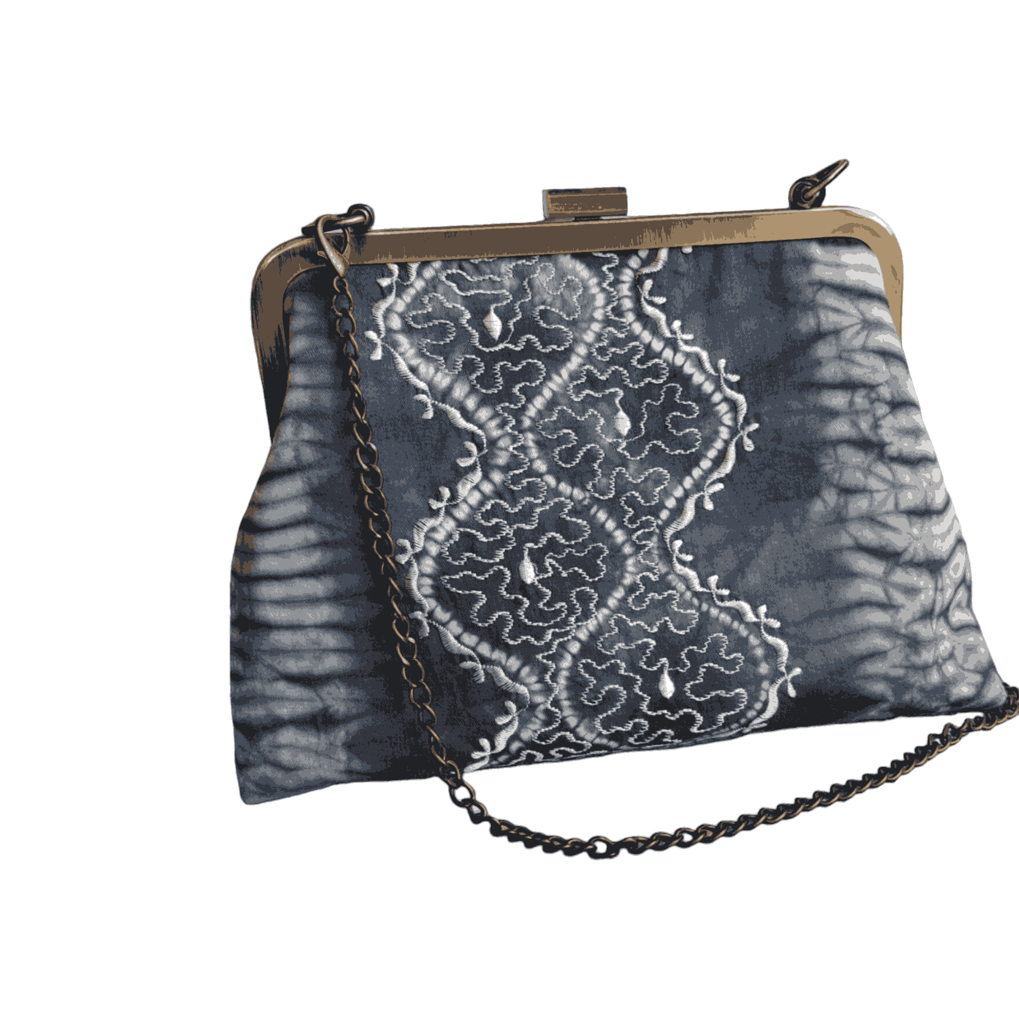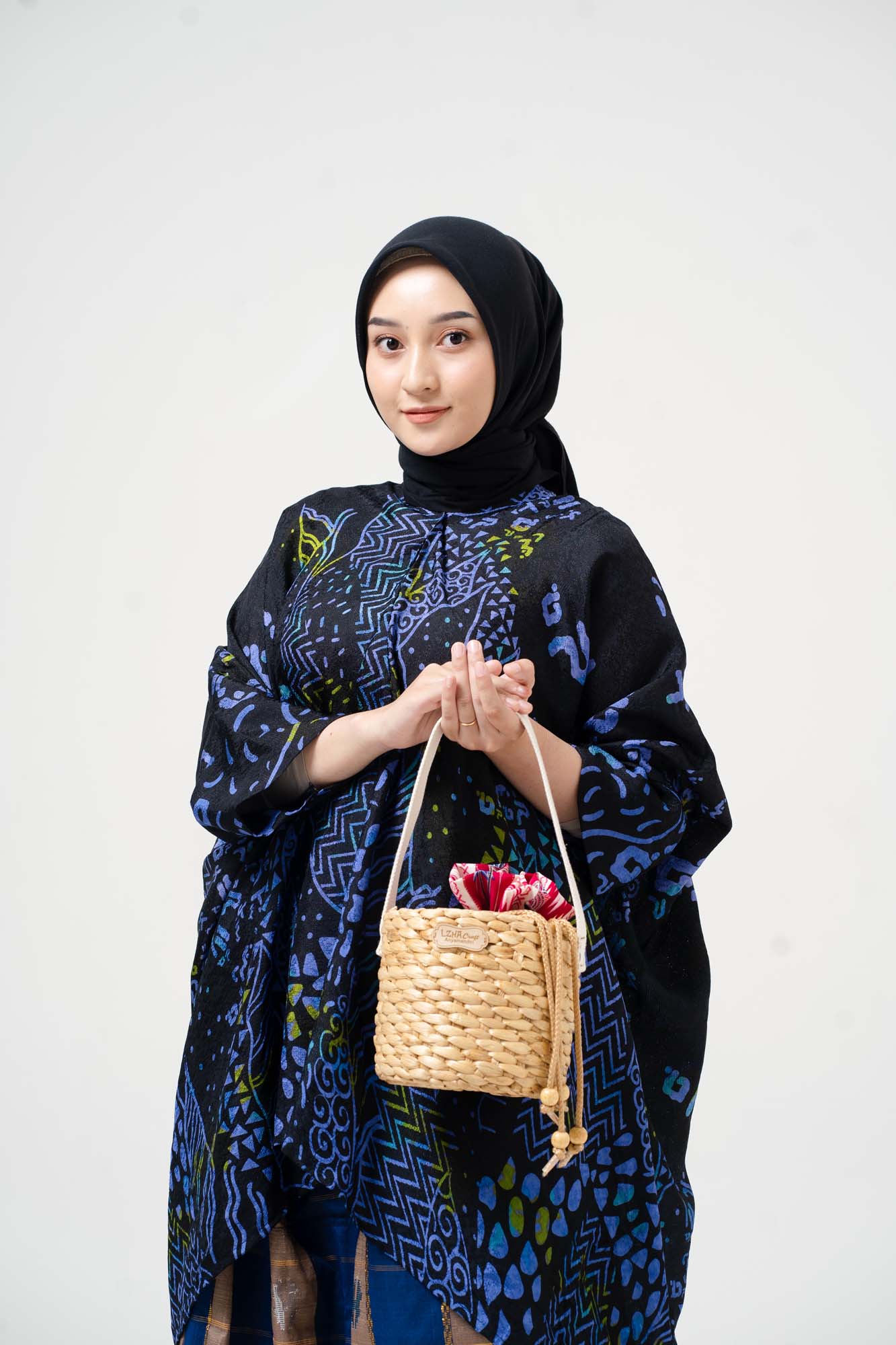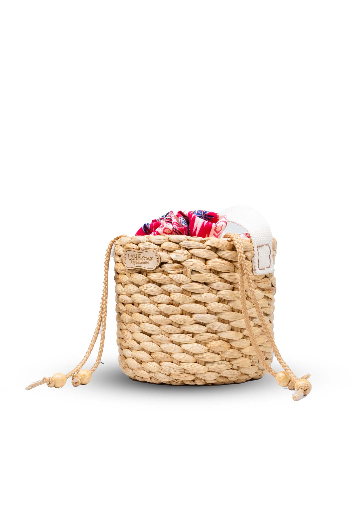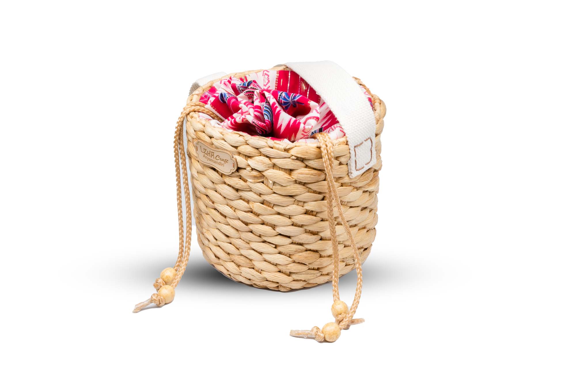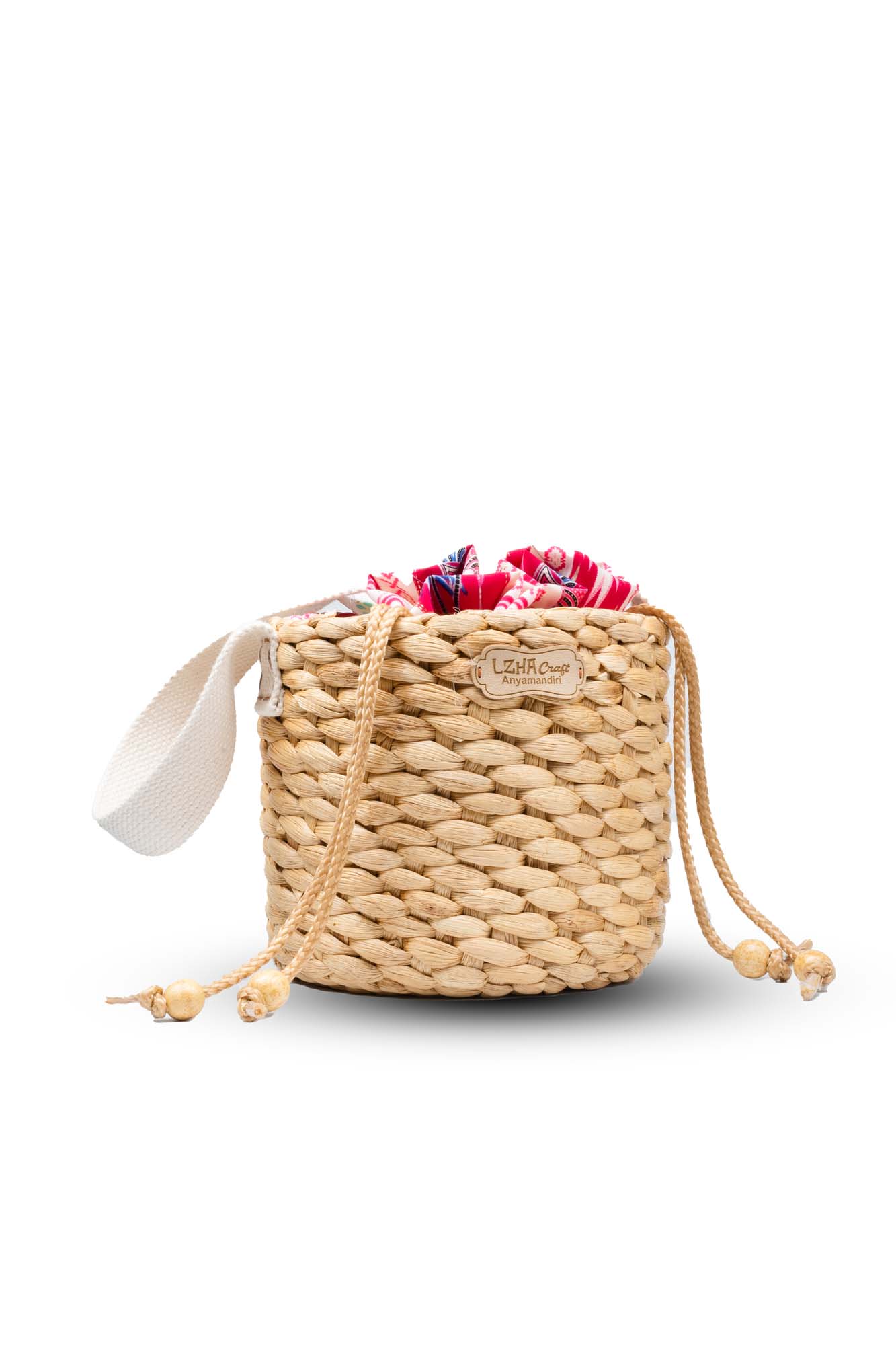 Sebuah tas anyaman berbahan dasar eceng gondok dengan variasi kain sutra
