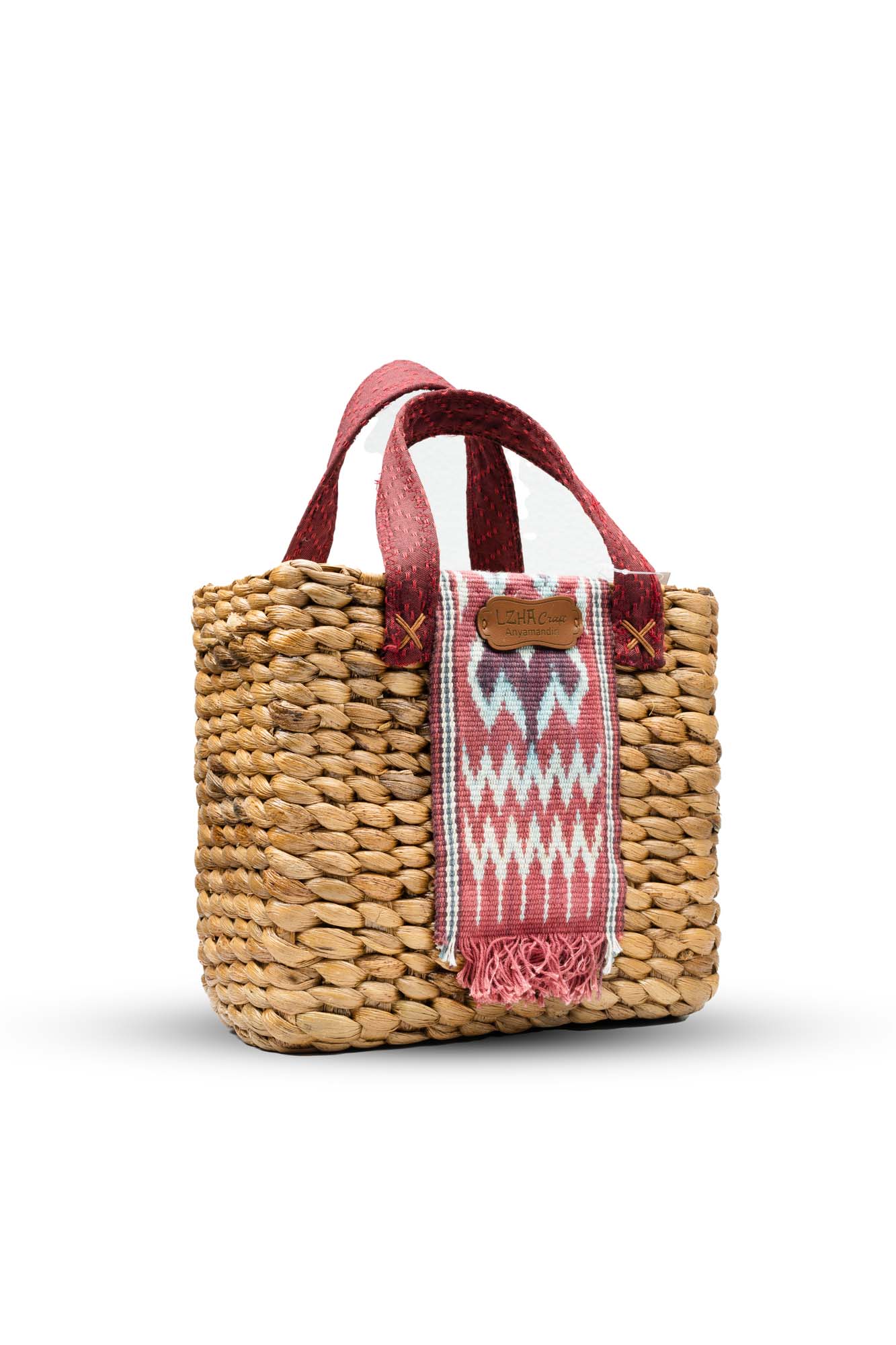 Sebuah tas anyaman berbahan dasar eceng gondok dengan variasi kain tenun ikat. Variasi tenun ikat motif tossok bale bermakna membenahi hal yang salah