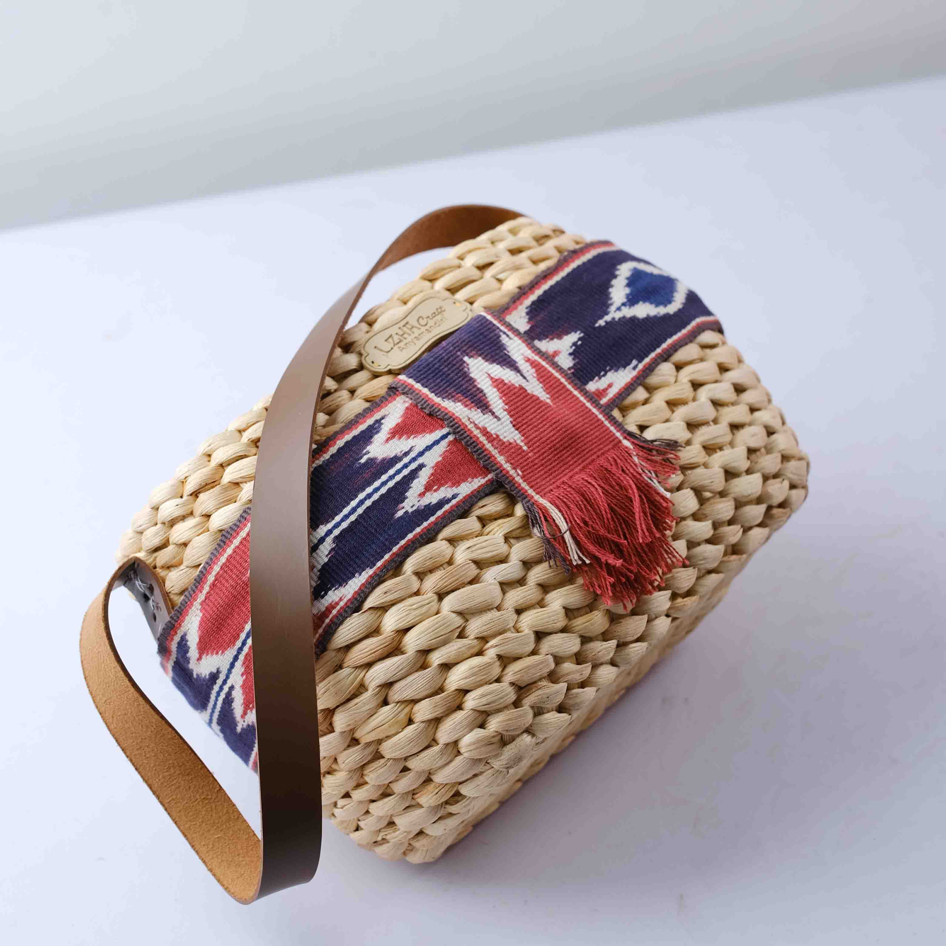 Sebuah tas anyaman berbahan dasar eceng gondok dengan variasi kain tenun ikat. Variasi tenun ikat motif tossok bale bermakna membenahi hal yang salah