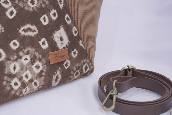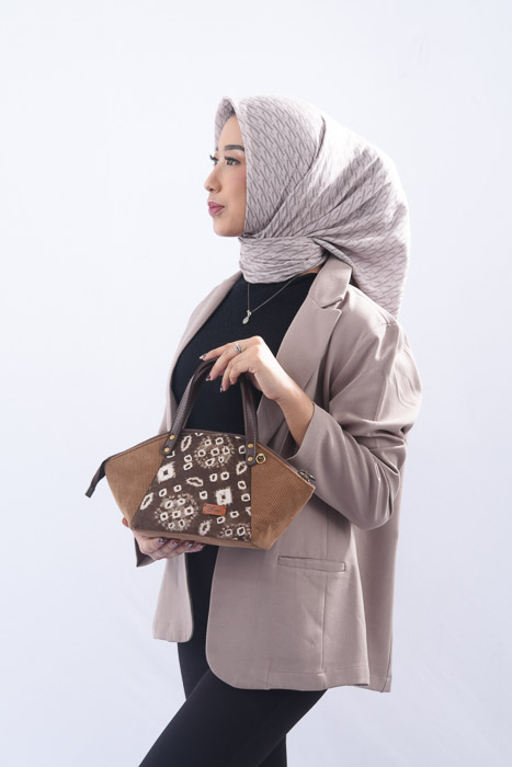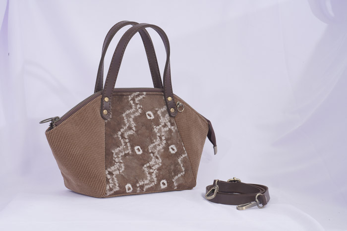 Jenis Bahan: - Bahan corduroy berwarna coklat - Kain jumputan Palembang dengan pewarna alam
