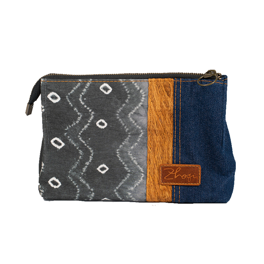 Terbuat dari paduan kain jumputan, bahan jeans warna navy dan kulit kayu, bagian dalam terdapat kantong sekat, kantong resleting dan 3 slot kartu. Dilengkapi dengan handel tangan terbuat dari kulit sintetis premium