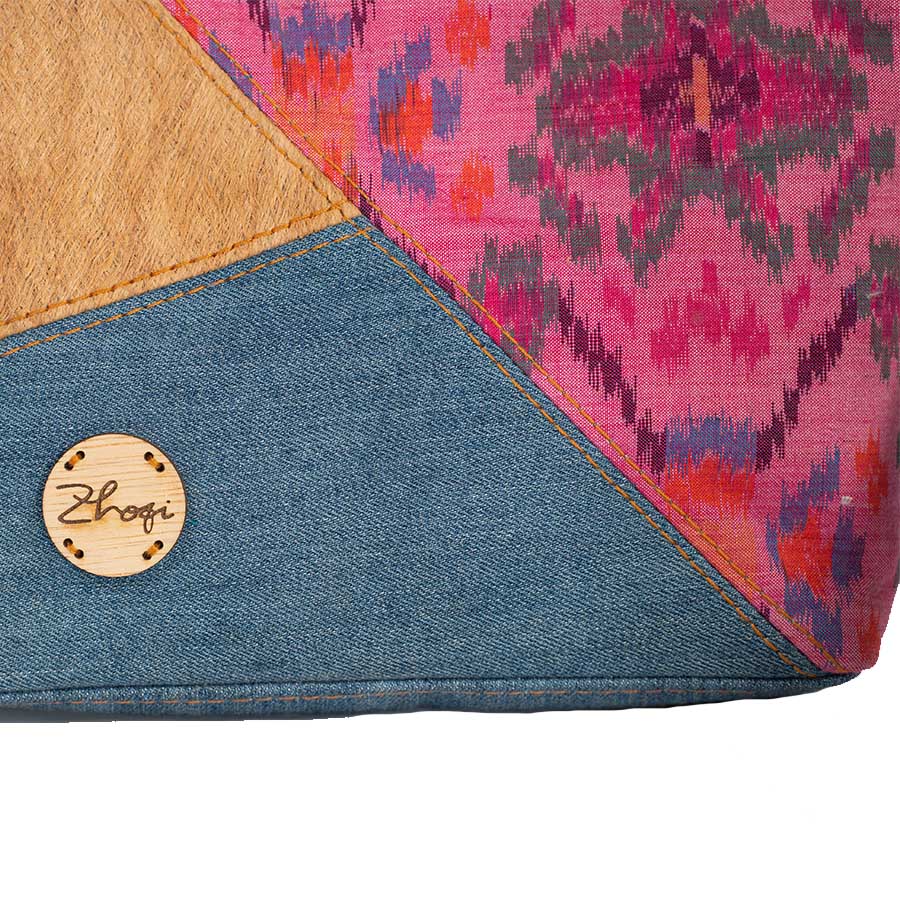 Terbuat dari paduan kain jumputan, bahan jeans warna biru muda dan kulit kayu, bagian dalam terdapat kantong resleting. Dilengkapi dengan handel tangan terbuat dari kulit sintetis premium