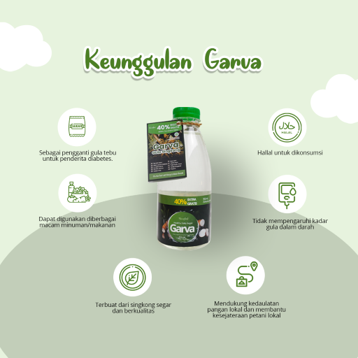 Gula Singkong GARVA merupakan gula buah (fruktosa) yang terbuat dari singkong pilihan dan berkualitas. Dapat digunakan untuk pengganti gula tebu yang digunakan sehari-hari. Cocok untuk minuman teh, kopi, es buah, dan masih banyak lagi. Bahkan bisa digunakan untuk membuat macam-macam kue.