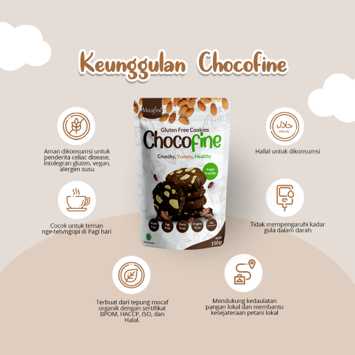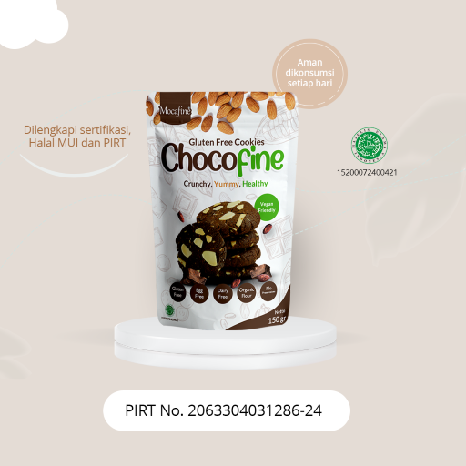 Chocofine adalah cookies sehat yang terbuat dari tepung mocaf organik terbaik. Perpaduan coklat dan topping Almond menjadikan Chocofine ingin dinikmati setiap saat. Cocok dinikmati bersama kopi atau susu. Selamat mencoba!