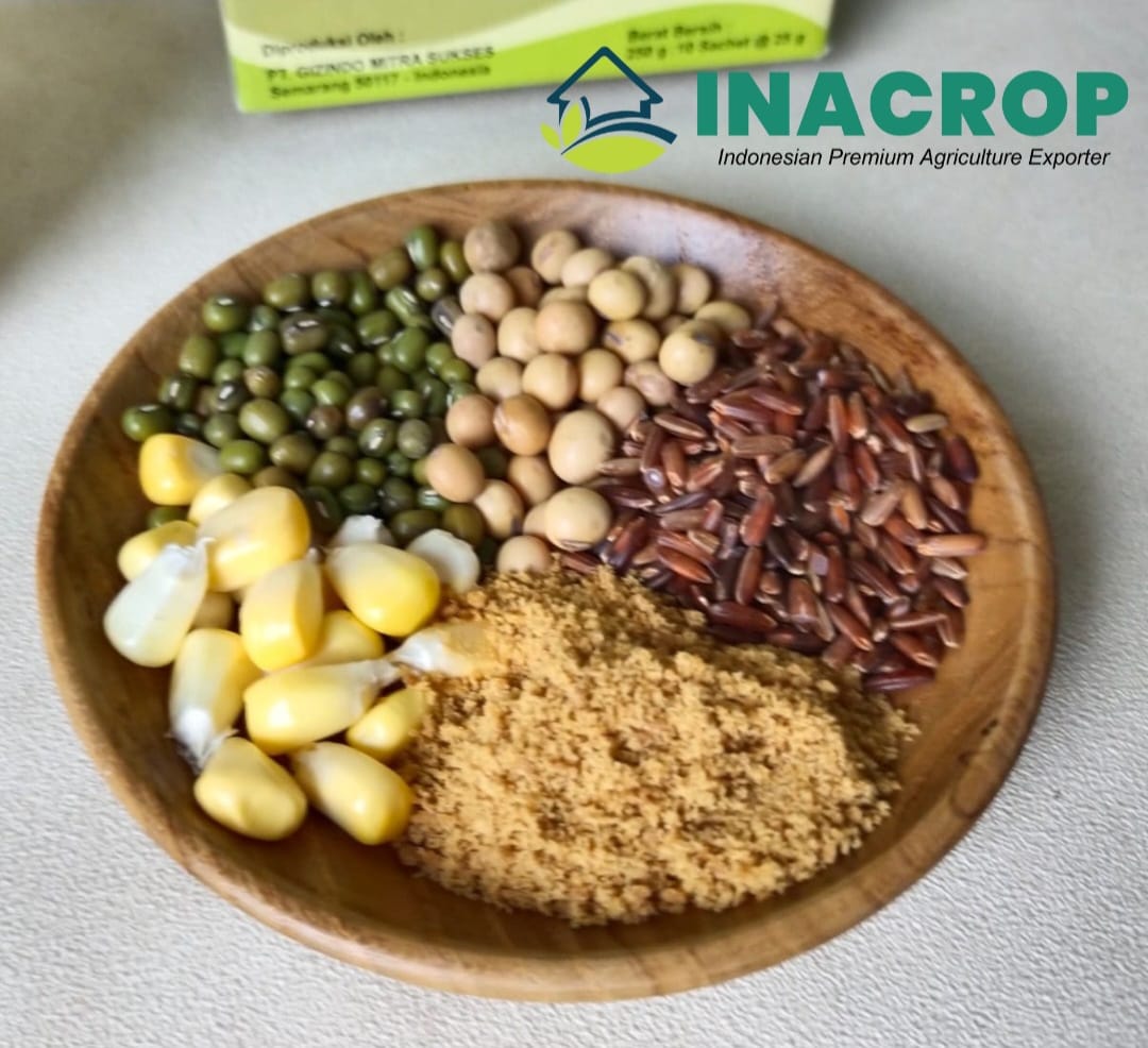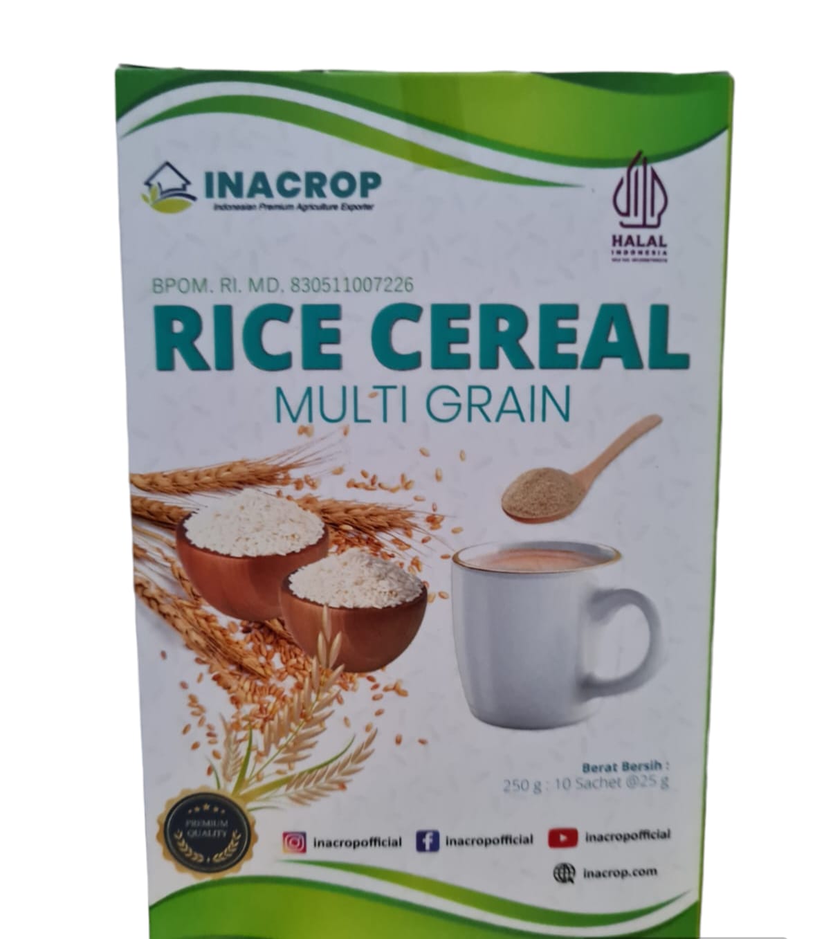 - Multigrain Cereal: Powder drink made of organic red rice which mixed with mung bean, soybean, corn and cane sugar. Soybean contain high levels of vegetable protein, as a substitute for animal protein. There are 3 variants of multigrain cereals; (sweet), less sugar, sugar free or no sugar.