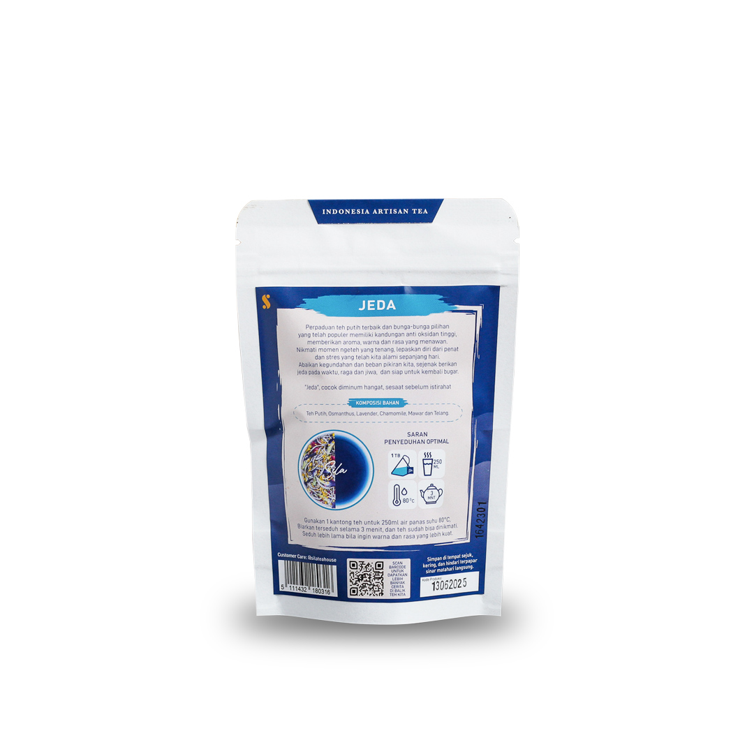 - Perpaduan bahan-bahan pilihan dengan antioksidan tinggi yang membantu tubuh kembali bugar, lepas dari penat dan stres yang telah kita alami sepanjang hari. Abaikan kegundahan dan beban pikiran kita, sejenak berikan jeda pada waktu, raga dan jiwa. “Jeda” menghantarkan anda pada sensasi rasa damai menenangkan. Cocok diminum hangat, sesaat sebelum istirahat.