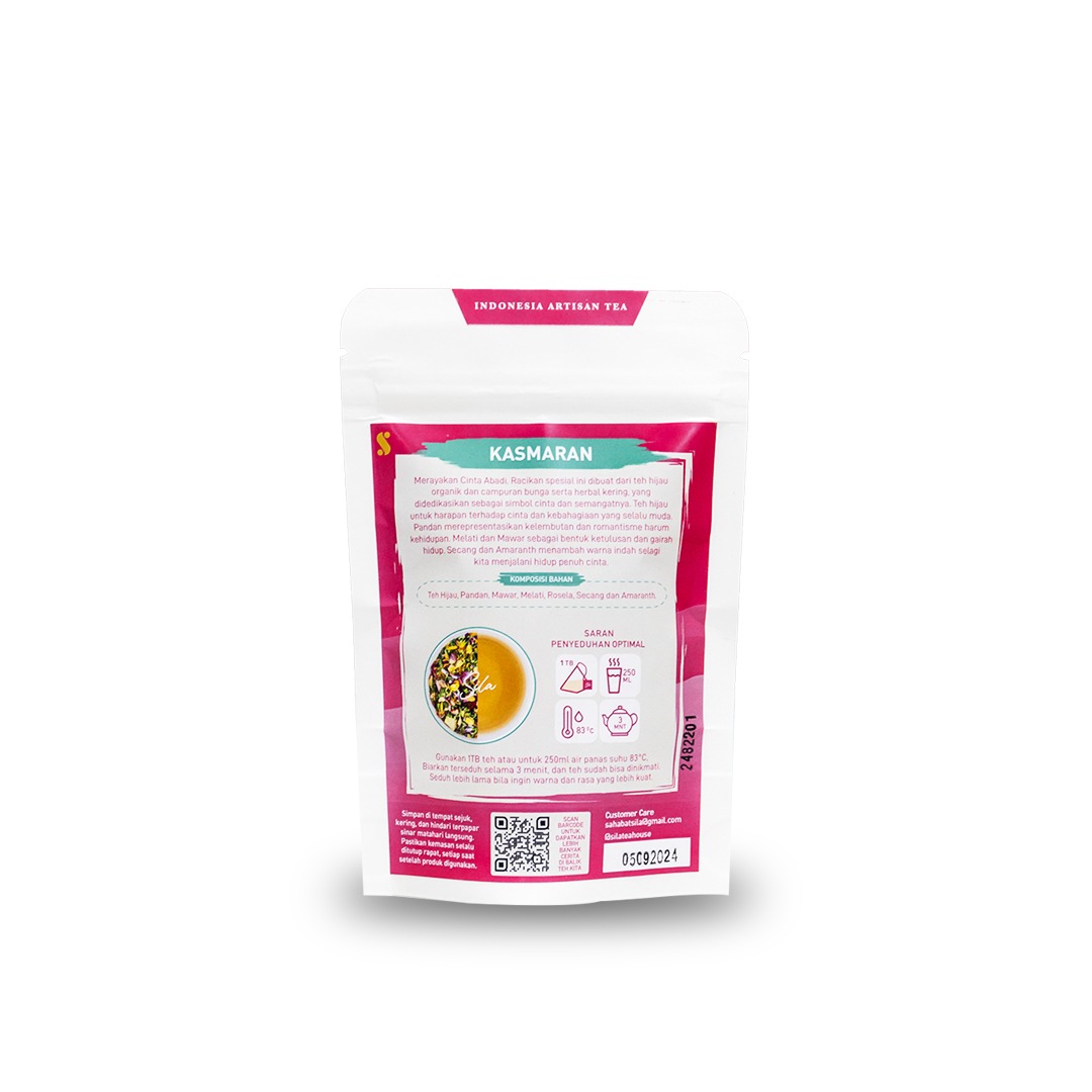 - Racikan spesial ini berisikan teh hijau organik dan bunga serta herbal pilihan yang kami rancang sebagai simbol dari semangat cinta. Teh hijau sebagai harapan untuk cinta dan kebahagiaan yang kekal. Daun pandan untuk kehidupan yang indah, romantis dan manis. Melati dan mawar melambangkan kemurnian dan gairah. Kayu secang dan bunga amaranth memberikan warna indah sepanjang perjalanan hidup penuh cinta.