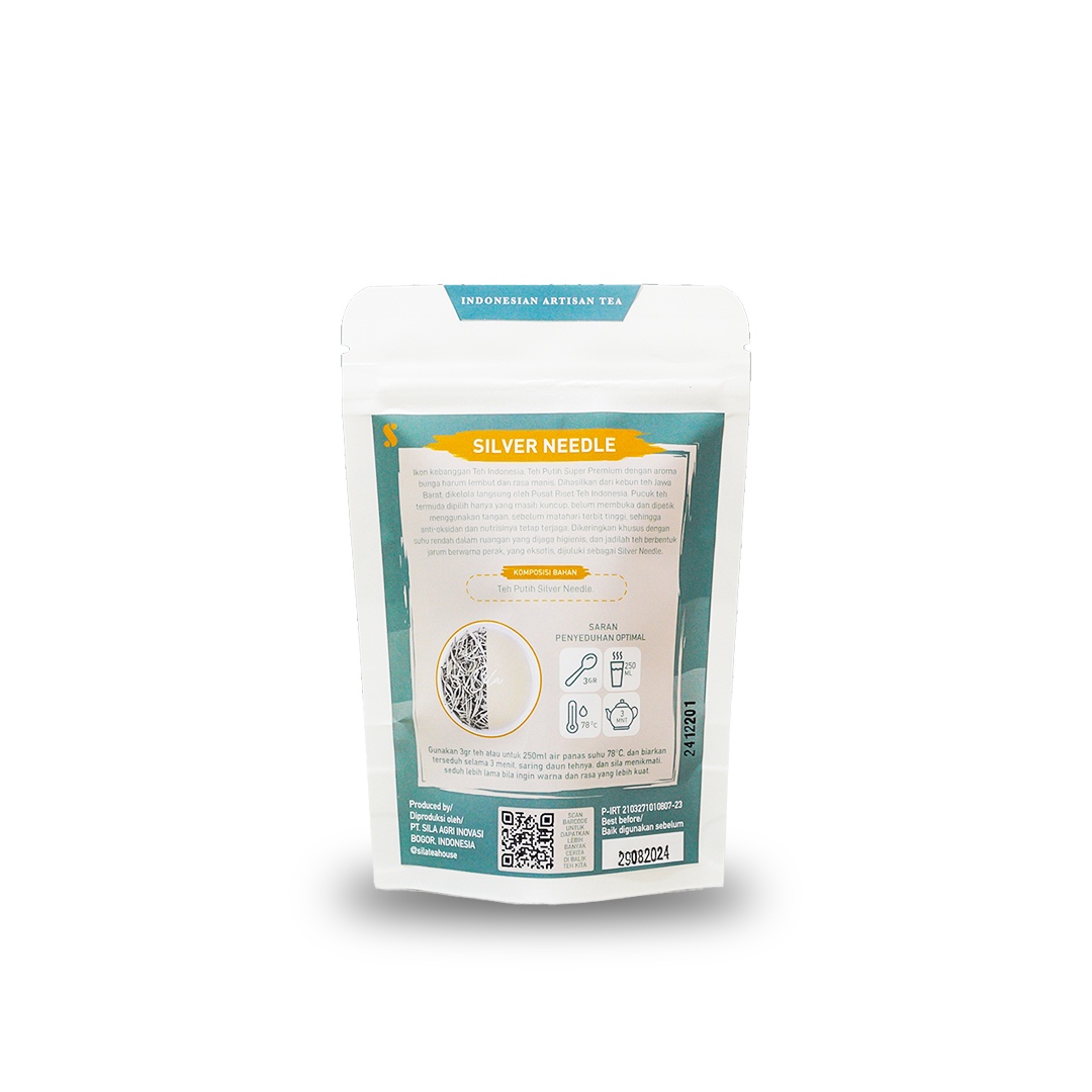 - Ikon kebangaan Teh Indonesia. Teh Putih Super Premium dengan aroma bunga harum lembut dan rasa manis. Pucuk teh teratas dengan antioksidan tertinggi. Teh asli Indonesia yang dihasilkan dari kebun teh Jawa Barat di ketinggian 1800mdpl, yang dikelola langsung oleh Pusat Riset Teh Indonesia. Pucuk teh termuda dipilih hanya yang masih kuncup, belum membuka dan dipetik menggunakan tangan. Dipetik sebelum matahari terbit tinggi, untuk menghindari proses vegetatif dan fotosintesis sehingga nutrisi di dalamnya tetap terjaga. Dikeringkan khusus dengan suhu rendah dalam ruangan yang dijaga higienis, dan jadilah teh berbentuk jarum berwarna perak, yang eksotis, dijuluki sebagai Silver Needle.