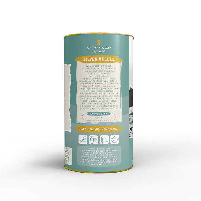 - Ikon kebangaan Teh Indonesia. Teh Putih Super Premium dengan aroma bunga harum lembut dan rasa manis. Pucuk teh teratas dengan antioksidan tertinggi. Teh asli Indonesia yang dihasilkan dari kebun teh Jawa Barat di ketinggian 1800mdpl, yang dikelola langsung oleh Pusat Riset Teh Indonesia. Pucuk teh termuda dipilih hanya yang masih kuncup, belum membuka dan dipetik menggunakan tangan. Dipetik sebelum matahari terbit tinggi, untuk menghindari proses vegetatif dan fotosintesis sehingga nutrisi di dalamnya tetap terjaga. Dikeringkan khusus dengan suhu rendah dalam ruangan yang dijaga higienis, dan jadilah teh berbentuk jarum berwarna perak, yang eksotis, dijuluki sebagai Silver Needle.