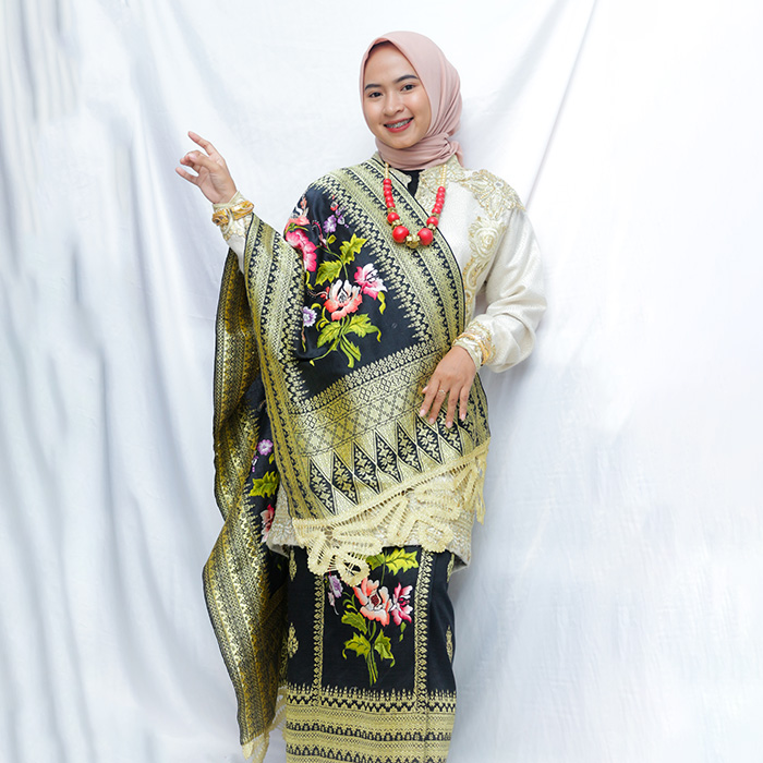 Makna Motif: The innovated Songket produces two sets of fabric motifs and can be displayed in two ways. The first set of motifs is bamboo shoot patterns, while the second set consists of flower patterns with hand embroidery. The Songket comes with a shawl adorned with embroidered flower motifs.