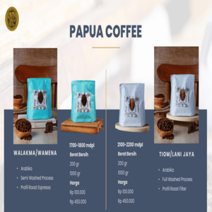 Biji kopi asli dari kawasan pegunungan timur Papua, yakni dari kampung Maksum, Distrik Okbab, Kabupaten Pegunungan Bintang. Diawali dengan memberikan edukasi berkelanjutan kepada kelompok petani kopi setempat, seperti pengetahuan mengenai mengenai penanaman kopi, perawanan tananamannya serta penanganan paska panen biji kopi, diharapkan dapat menghasilkan biji kopi dengan kualitas terbaik dan citrarasa yang unik. Kopi dari Kabupaten Paniai saat ini sedang kami kembangkan dan tentunya dengan terus membina petani kopi setempat.