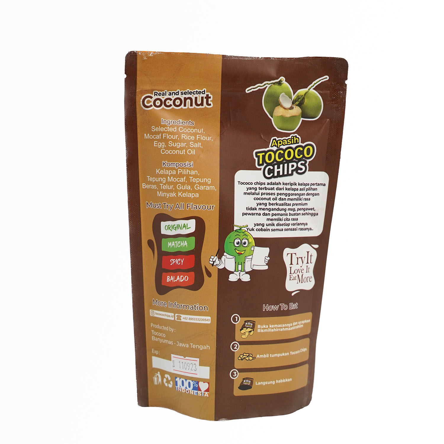 Tococo Chips Original terbuat dari kelapa asli pilihan yang digoreng dengan minyak kelapa dan memiliki rasa yang berkualitas premium. Tidak mengandung MSG, pengawet, pewarna dan pemanis buatan sehingga memiliki cita rasa yang unik.