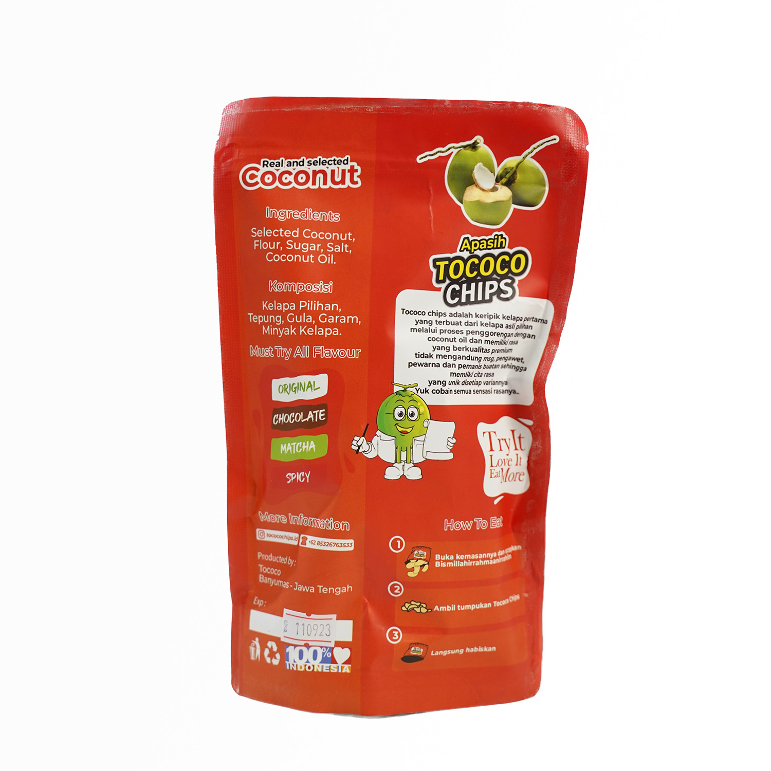 Tococo Chips Original terbuat dari kelapa asli pilihan yang digoreng dengan minyak kelapa dan memiliki rasa yang berkualitas premium. Tidak mengandung MSG, pengawet, pewarna dan pemanis buatan sehingga memiliki cita rasa yang unik.