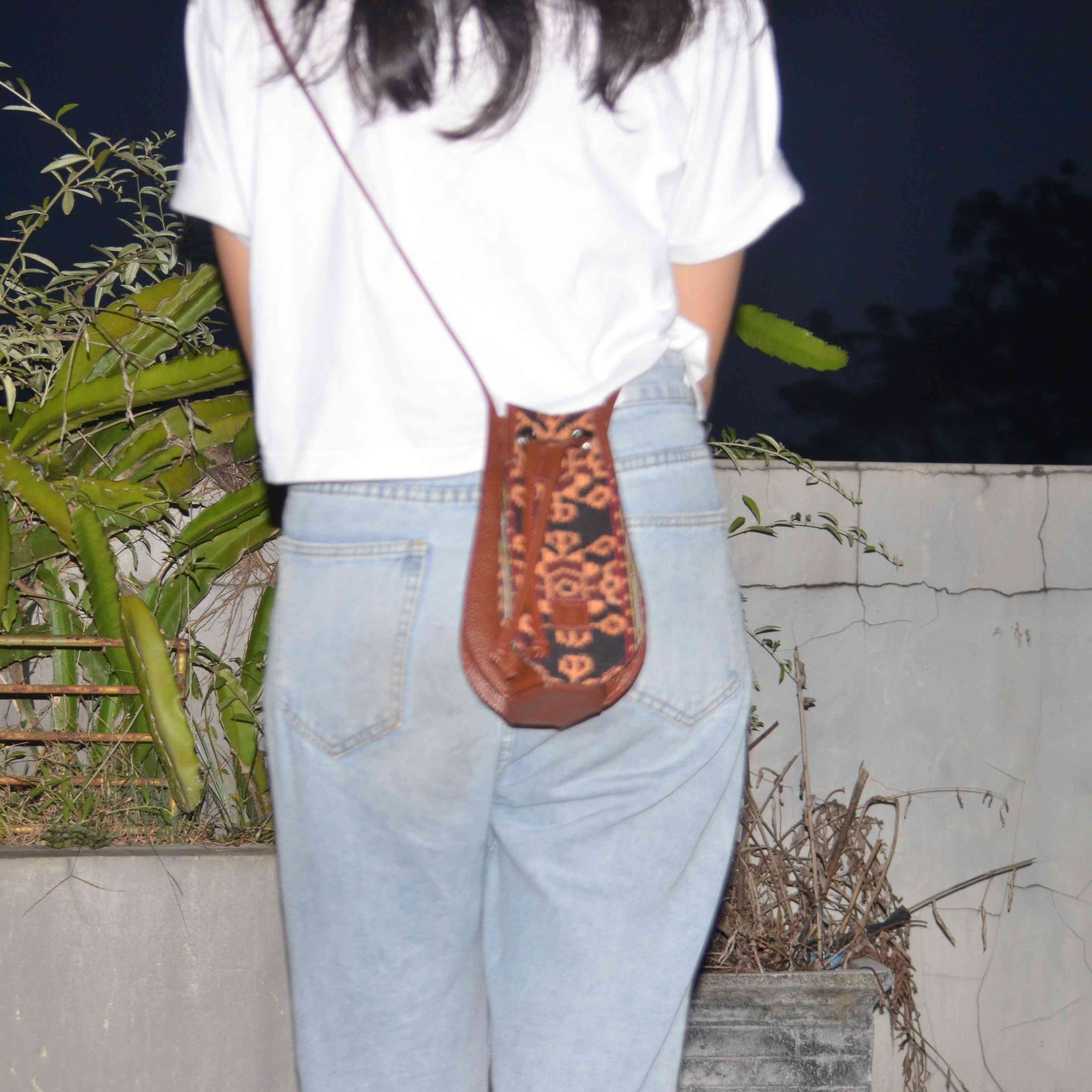 Jenis Bahan: Kulit Sapi dikombinasikan dengan Kain Tenun Nusa Tenggara Timur. (Cow Leather combined with East Nusa Tenggara Woven Fabric)