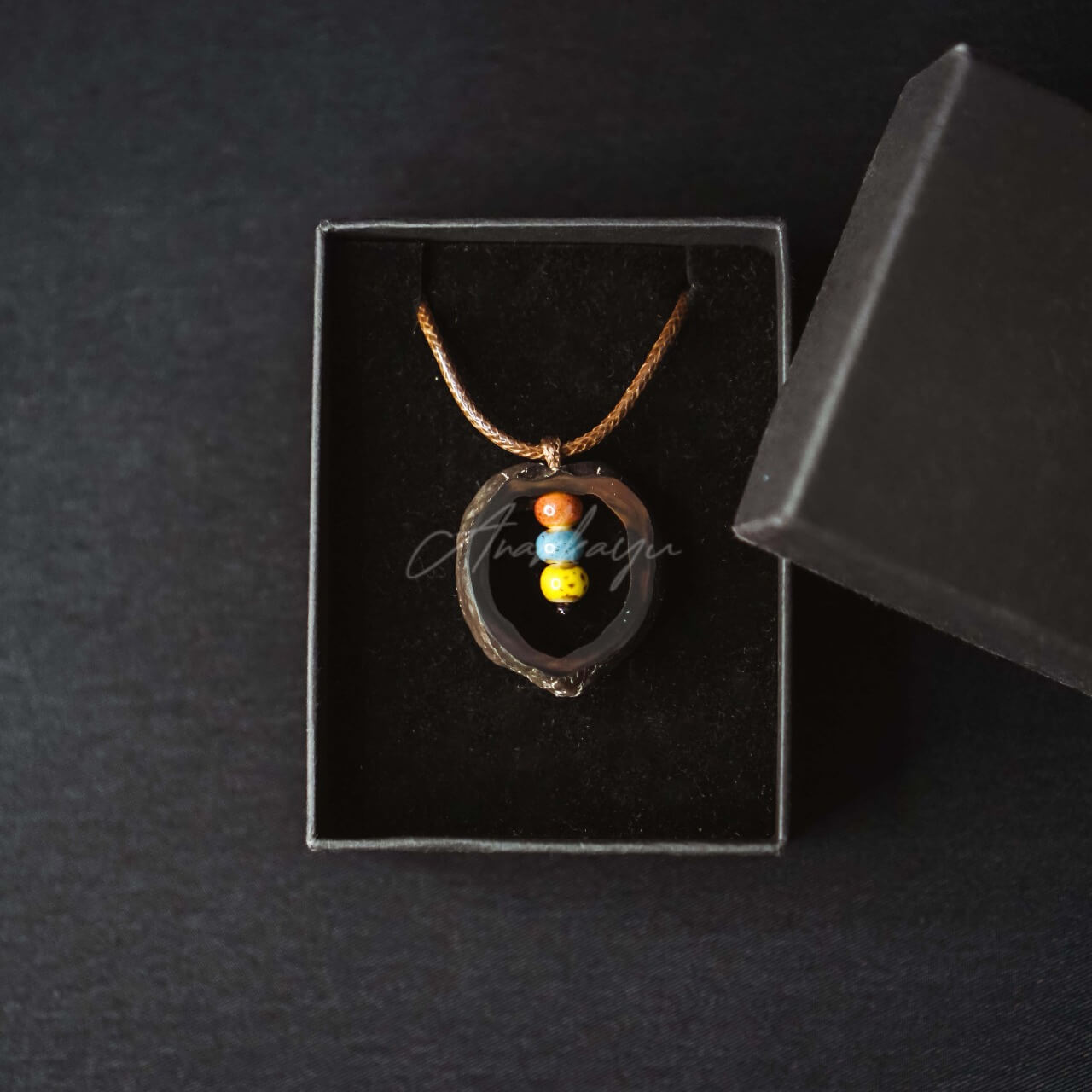 Jenis Bahan: Liontin luar : Kemiri; Liontin Dalam : 3 biji Keramik; Tali : Kulit Sintetis