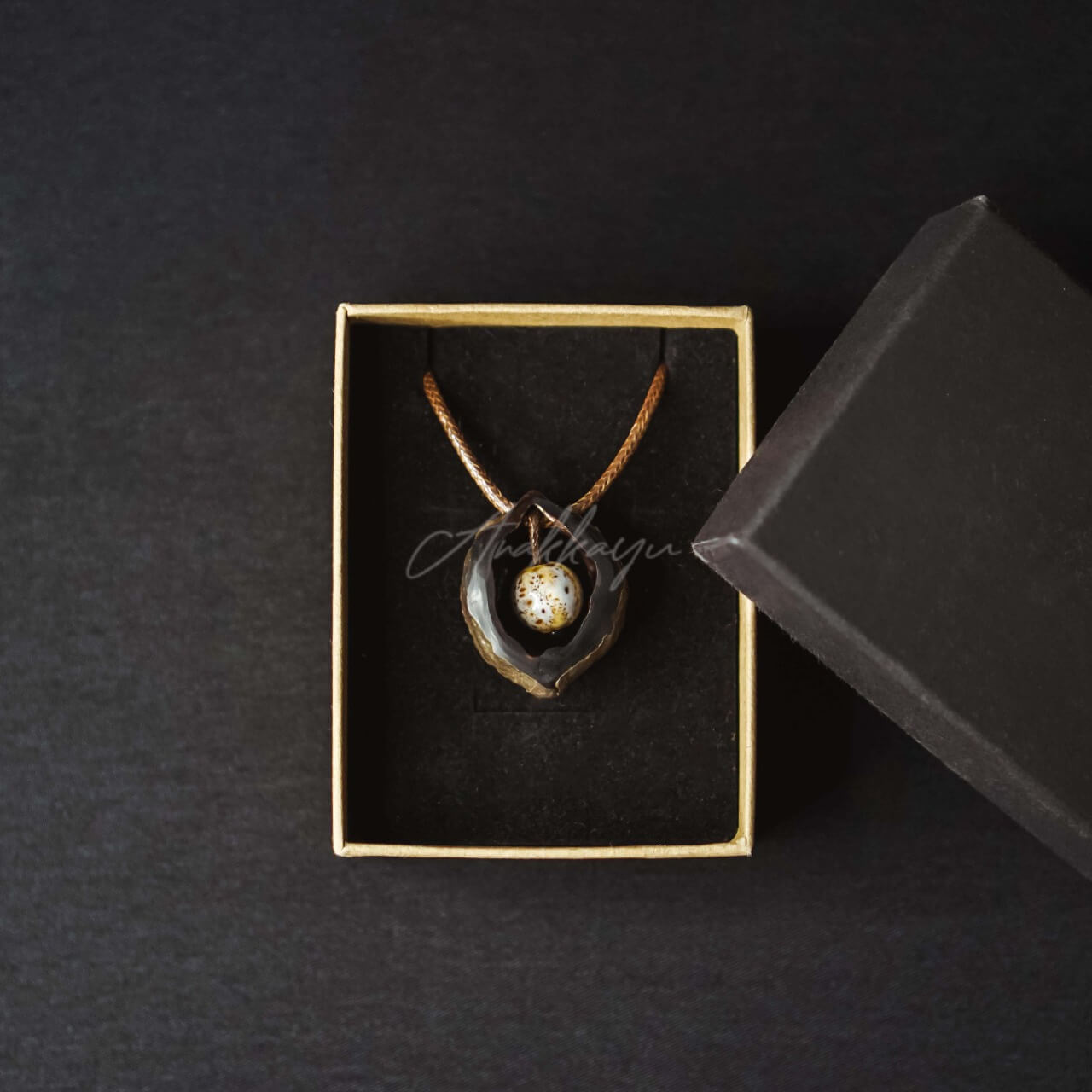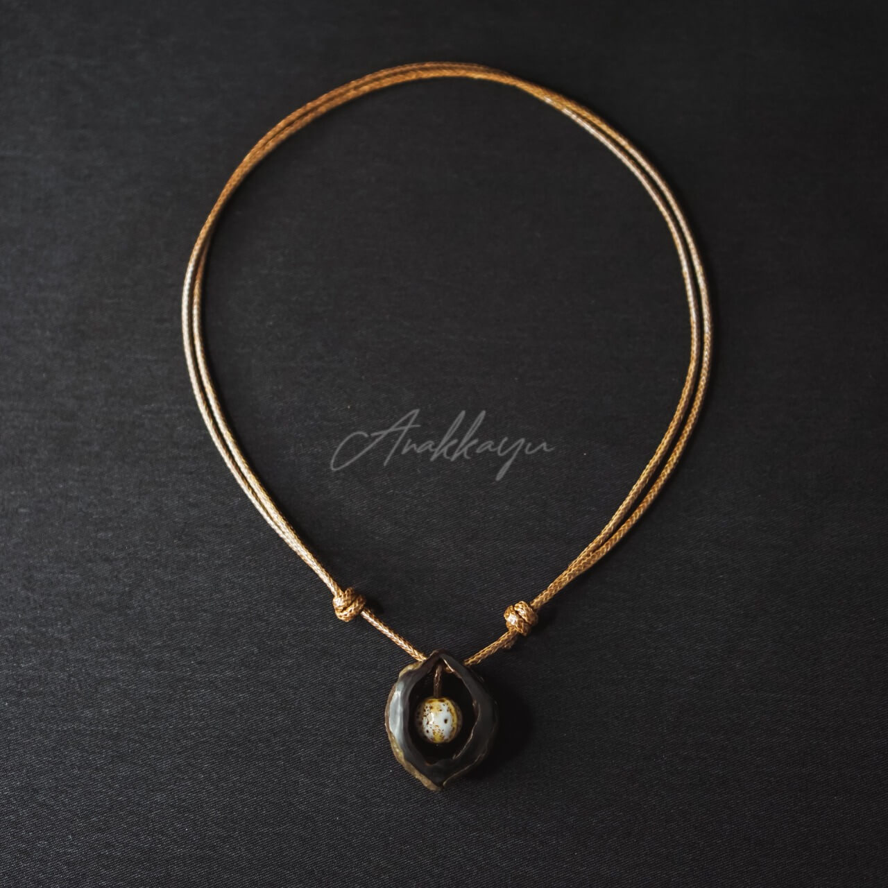 Jenis Bahan: Liontin luar : Kemiri; Liontin Dalam : Keramik; Tali : Kulit Sintetis