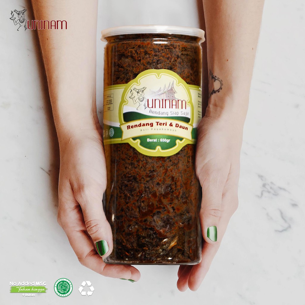 Rendang Teri dan Daun Uninam di masak dengan menggunakan resep tradisi keluarga yg sudah turum temurun ,dimasak menggunakan tungku kayu dengan bahan bahan alami, berkualitas premium. Tanpa menggunakan MSG dan bahan pengawet, dikemas dengan tampilan kemasan yg cantik menarik dan hygienis.