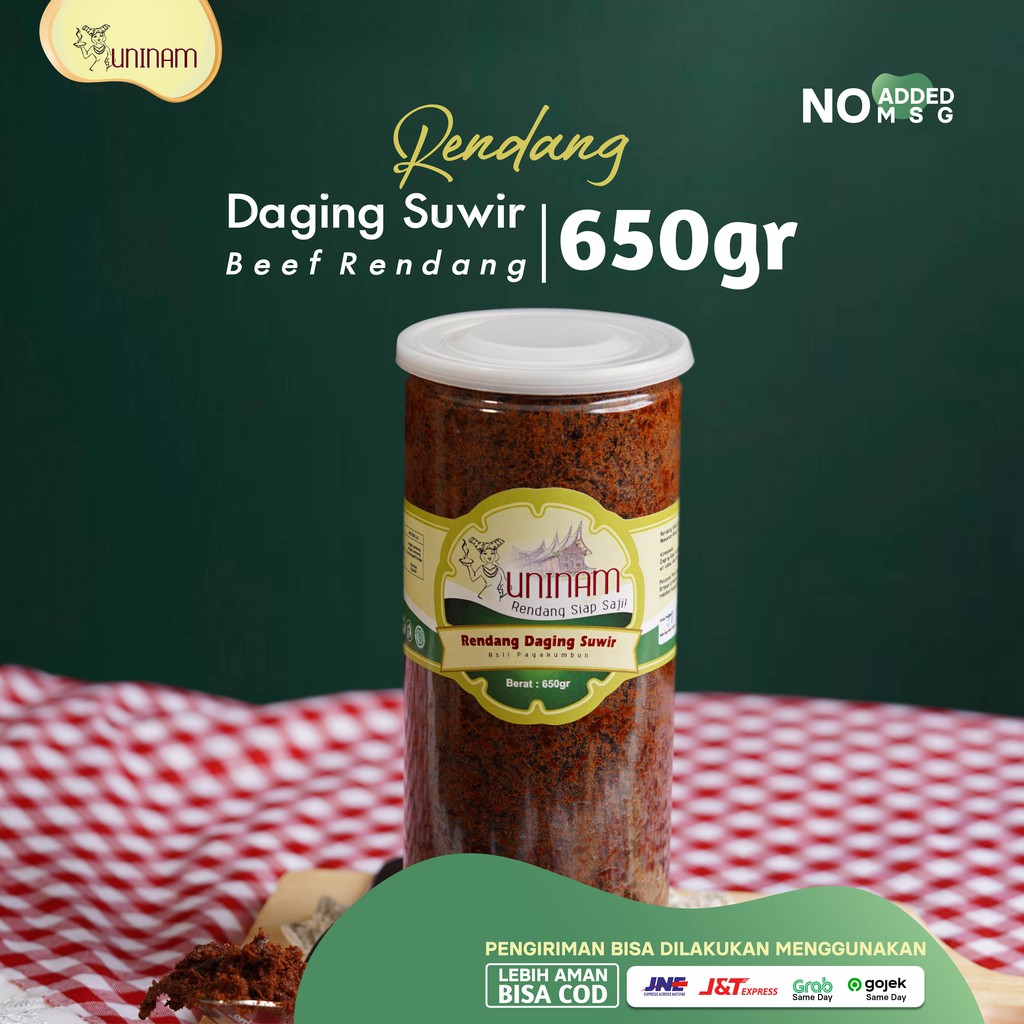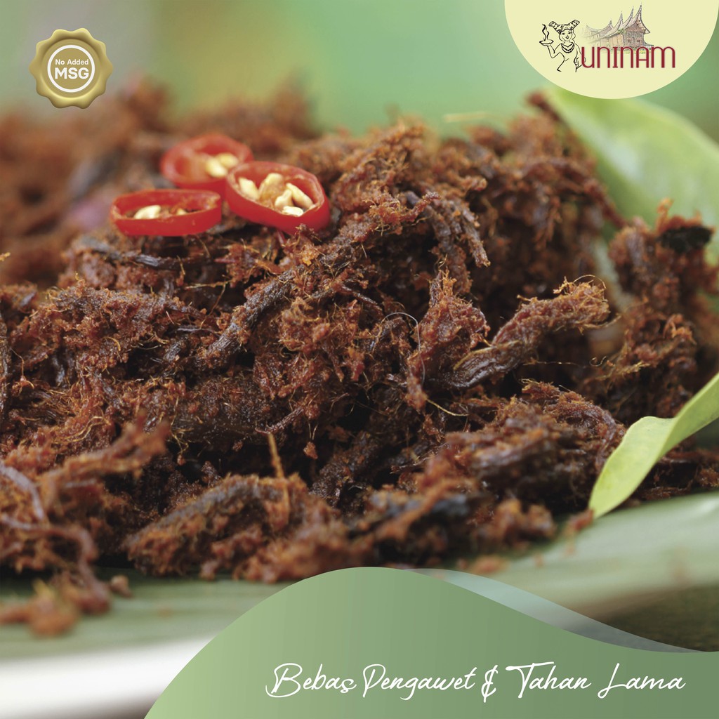 Rendang Daging Suwir Uninam menggunakan daging sapi has dengan kualitas yg bagus, daging has sapi disuwir-suwir memanjang, dimasak menggunakan bahan-bahan kualitas baik lainnya, santan kelapa khas payakumbuh yg terkenal "kamek" / gurih manis legit . Perpaduan santan dan racikan rempah beraroma kuat, bumbu bumbu resep rahasia tradisi keluarga menghasilkan Rendang Daging Suwir Uninam sedap, nikmat menggoda setiap orang untuk mencoba. Cocok dihidangkan sebagai lauk pendamping nasi, bahkan cocok pula di makan dengan roti, salad, kombinasi sushi.