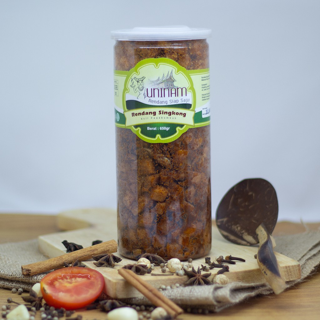 Singkong ubi jalar di olah sedemikian rupa menjadi rendang yg crispy, kriuk kriuk, sedap. cocok di jadikan cemilan yg unik. Rendang Singkong Uninam, dimasak dengan menggunakan tungku kayu, sampai kering. Karnanya Singkong Uninam dapat tahan lama 10 bulan dalam kemasan, walaupun tanpa menggunanakan bahan pengawet.