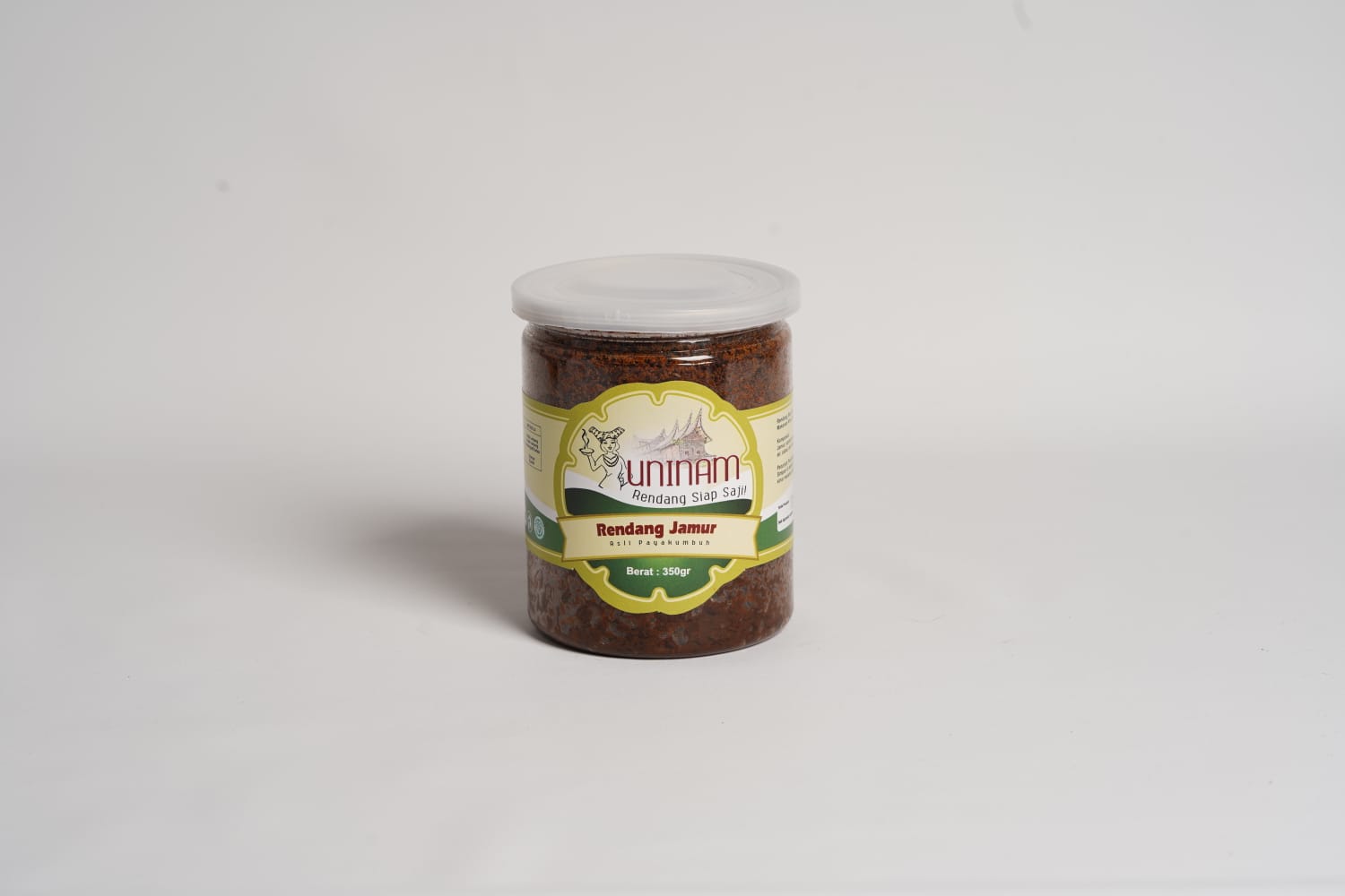 Rendang Jamur Uninam menggunakan jamur tiram, santan, bumbu dan bahan lainnya yg segar. Dimasak secara tradisional menggunakan resep turun temurun keluarga menggunakan tungku kayu, tidak menggunakan bahan penyedap - MSG dan tanpa bahan pengawet .