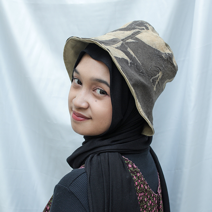 Bucket hat atau topi yang berbahan dasar kanvas yang sudah di ecoprint dengan dedaunan dan pewarna alami. Juga menggunakan bahan dasar lainnya seperti kain berbahan dasar tenun.