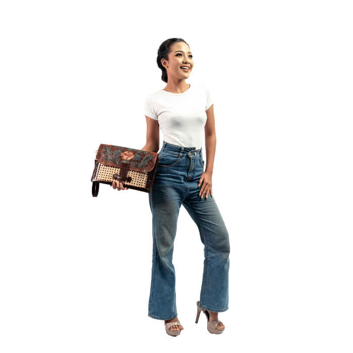 Clutch yang dibuat dari kolaborasi antara WH Bali dan ROTB (Rotanbi) memadukan antara kulit sapi dengan proses Ukir dan Lukis bermotif Patra Mawar dengan anyaman rotan sudamal, bisa digunakan untuk acara penting ataupun tas Ipad