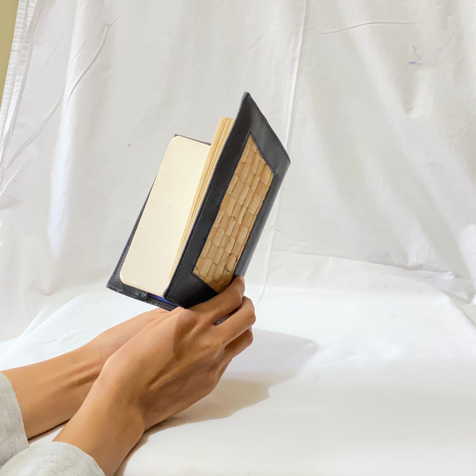 Cover buku terbuat dari paduan kulit sintetis dan anyaman eceng gondok