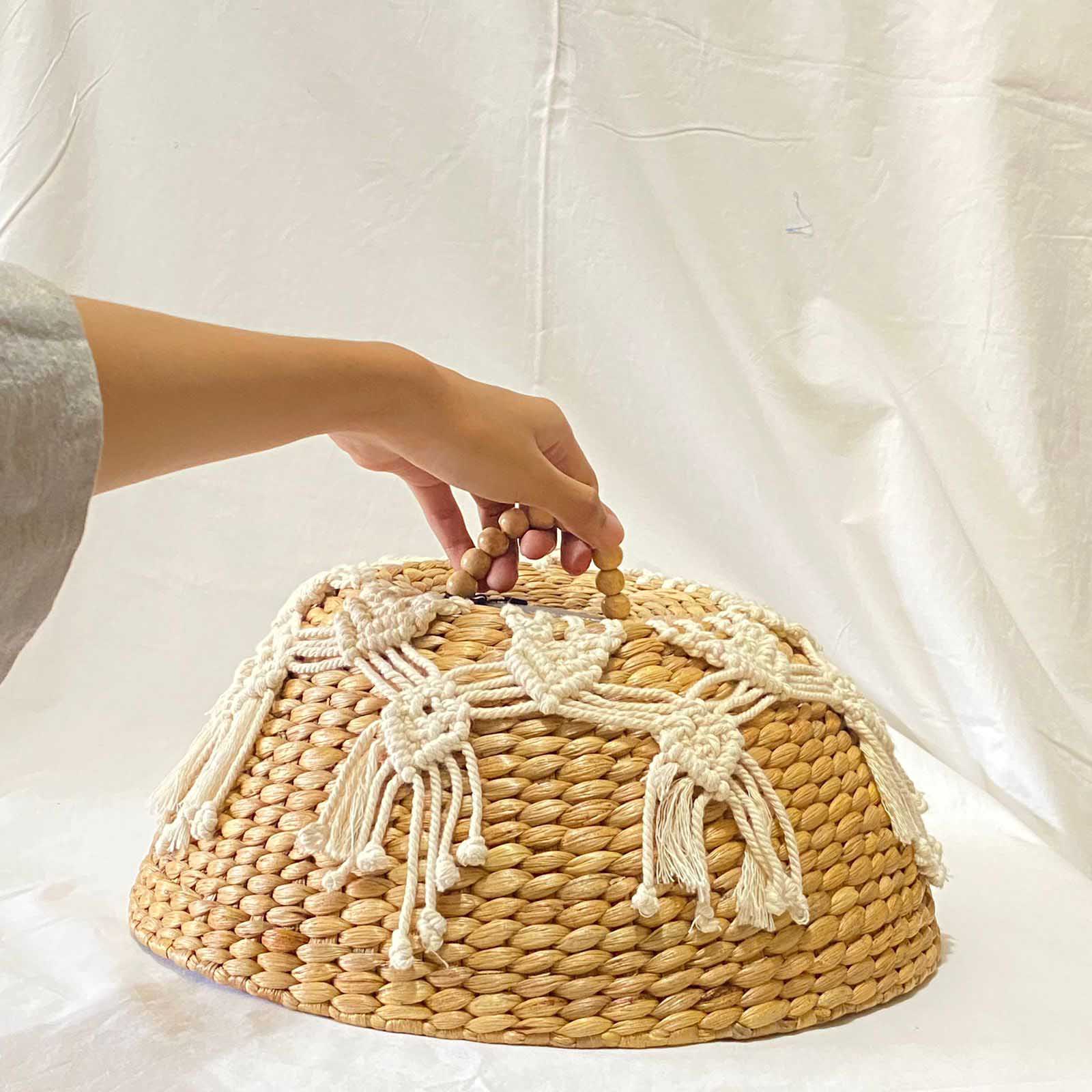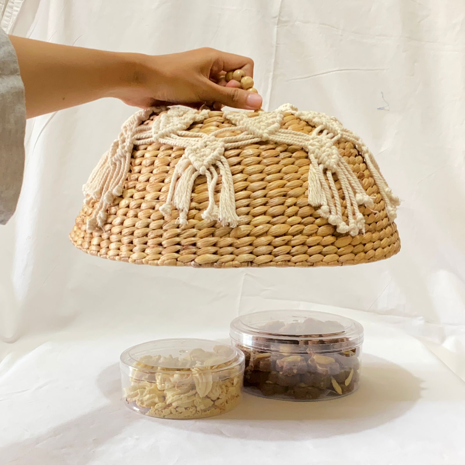 Tudung saji eceng gondok dengan hiasan makrame berwarna putih
